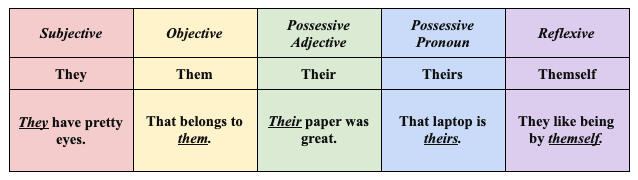 Other examples of ways we might use they/them pronouns in professional and academic environments include:They wrote this fantastic carrd resource on pronoun usage that you should check out